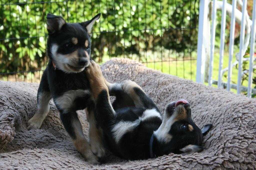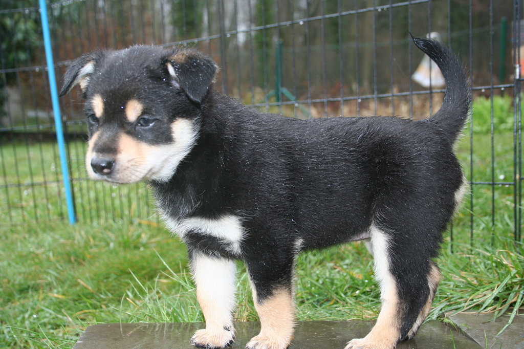 16.03.2105 Hündin Nr. 3 wog heute morgen 2007g. Die Fleischmahlzeit heute abend schmeckte ihr richtig gut, und sie hatte hinterher einen ganz schön runden Bauch. Hündin 3 ist neugierig und immer zum Spielen aufgelegt. Sie steigt auf die Spielaufforderungen der anderen bereitwillig ein, und es stört sie auch nicht, wenn andere über sie hinwegkugeln und sie mal unten drunter liegt.