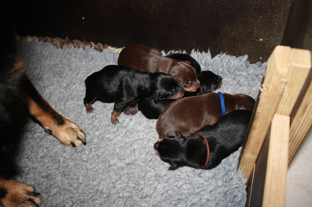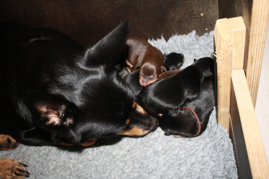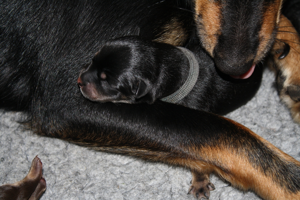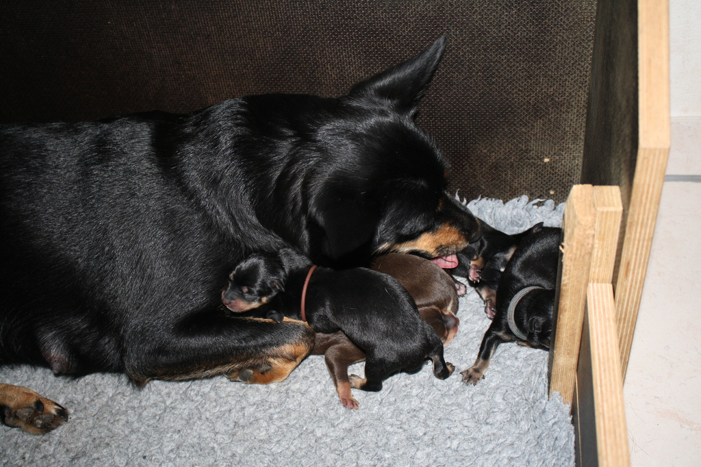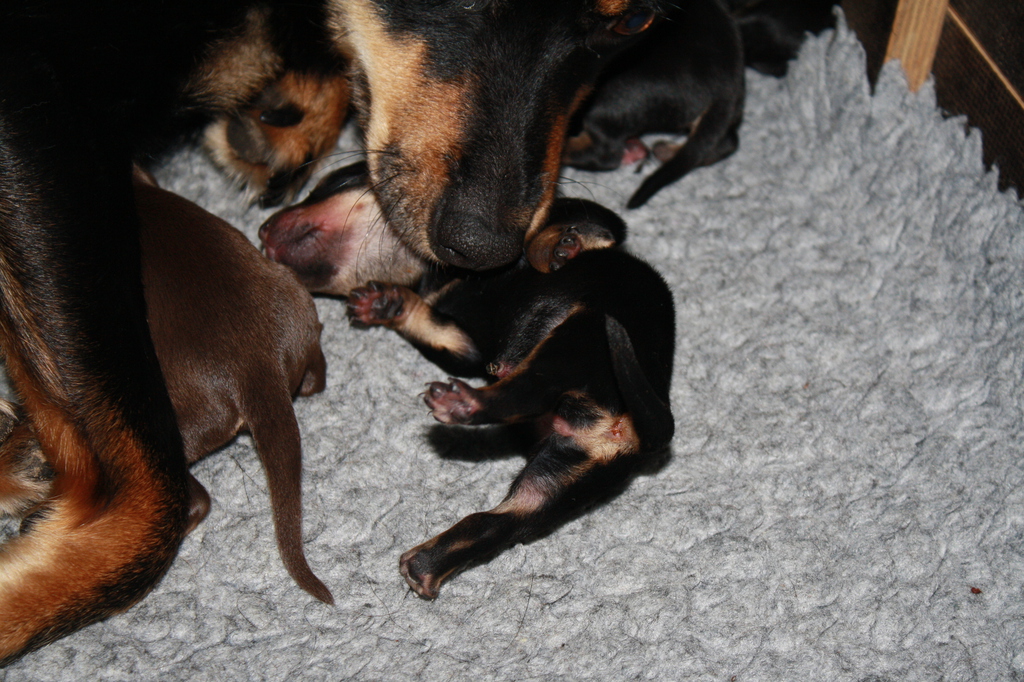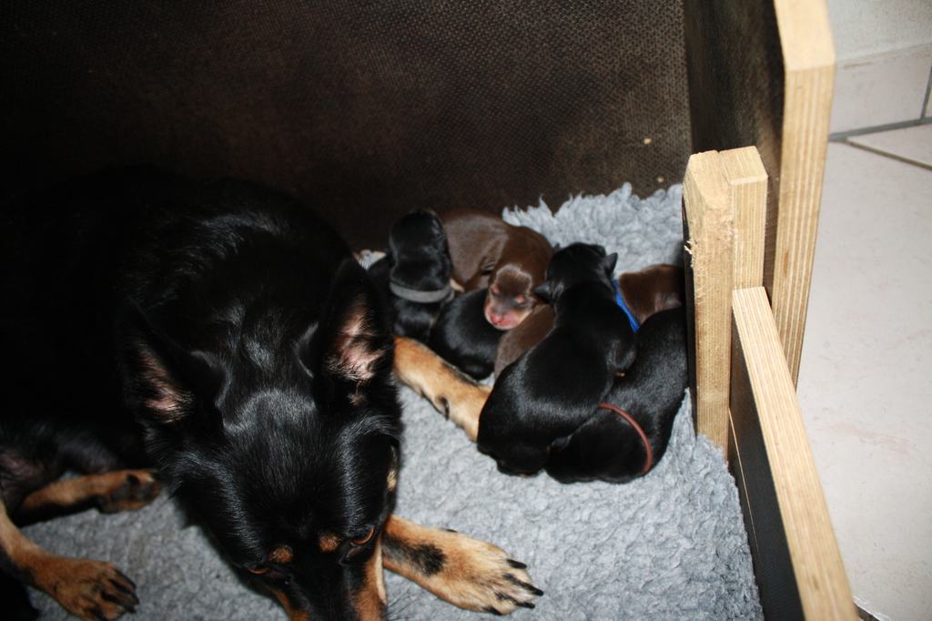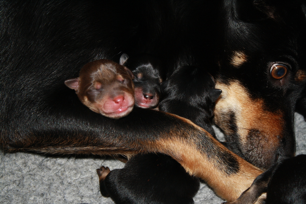 C-Wurf , 1 Tag alt. Gar nicht so einfach, ein paar gute Fotos hinzukriegen. Erst recht nicht, wenn die Mama Luzie heißt und eine Super-Mama ist, die ganz genau aufpasst, daß keiner verloren geht.