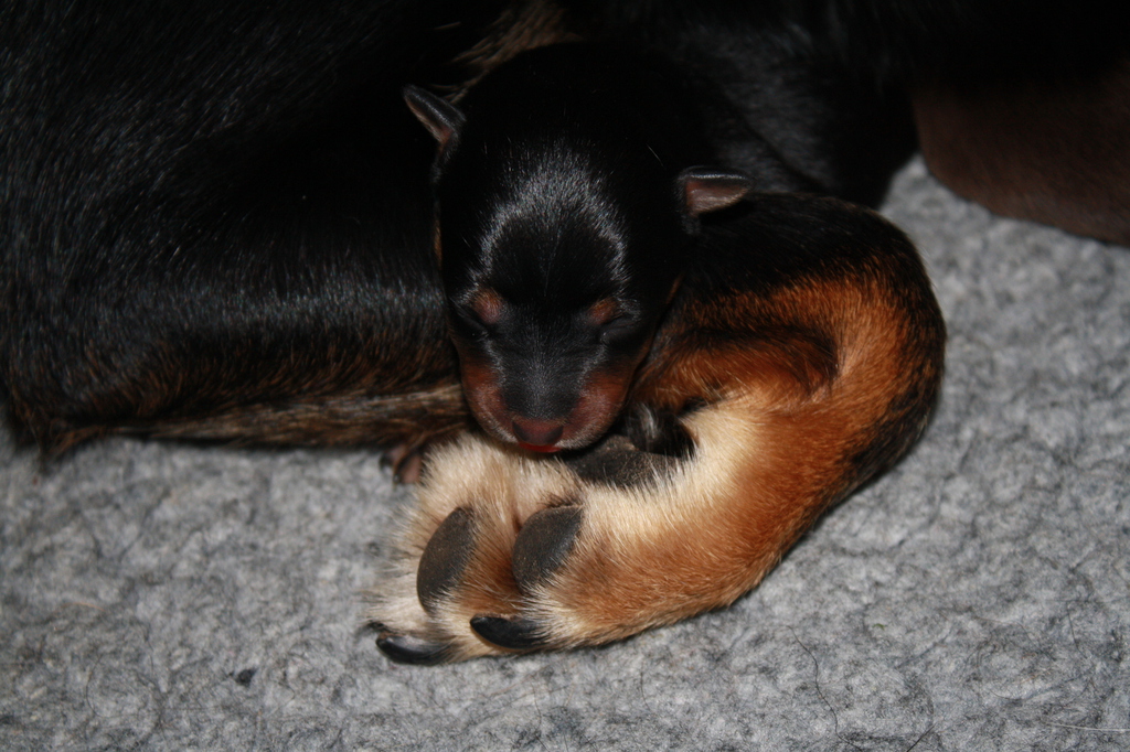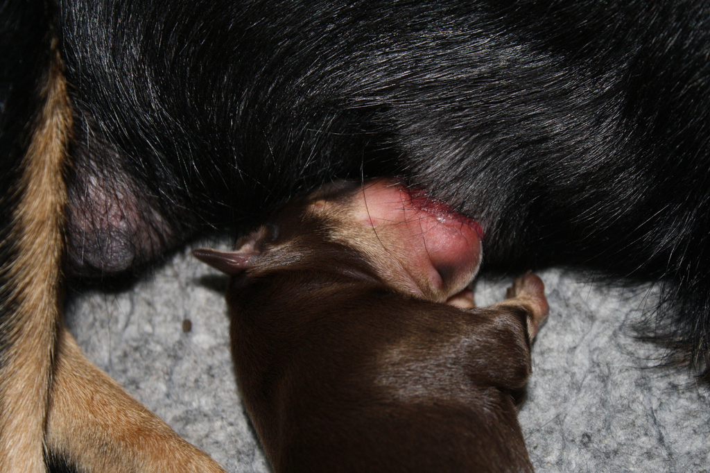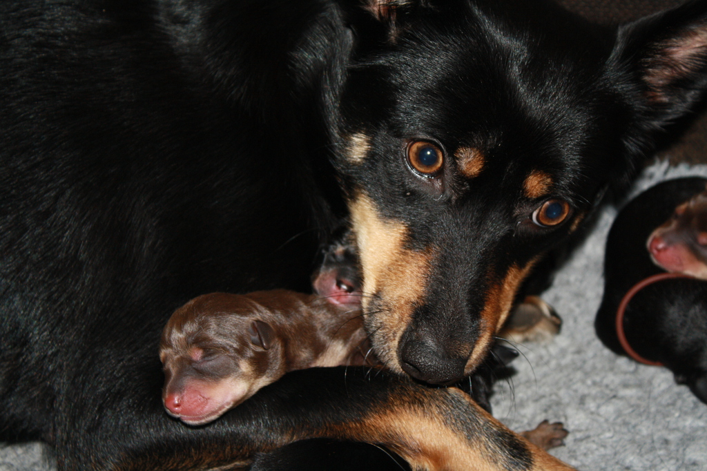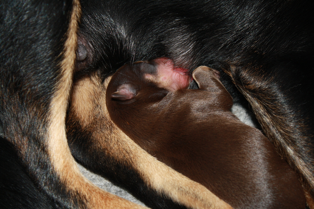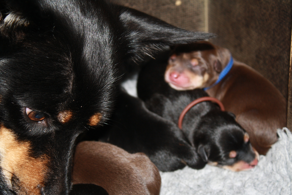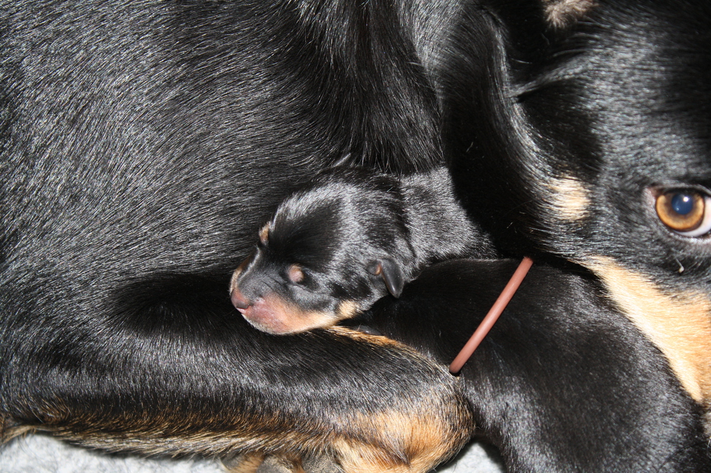 C-Wurf , 1 Tag alt. Gar nicht so einfach, ein paar gute Fotos hinzukriegen. Erst recht nicht, wenn die Mama Luzie heißt und eine Super-Mama ist, die ganz genau aufpasst, daß keiner verloren geht.