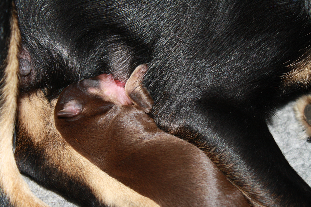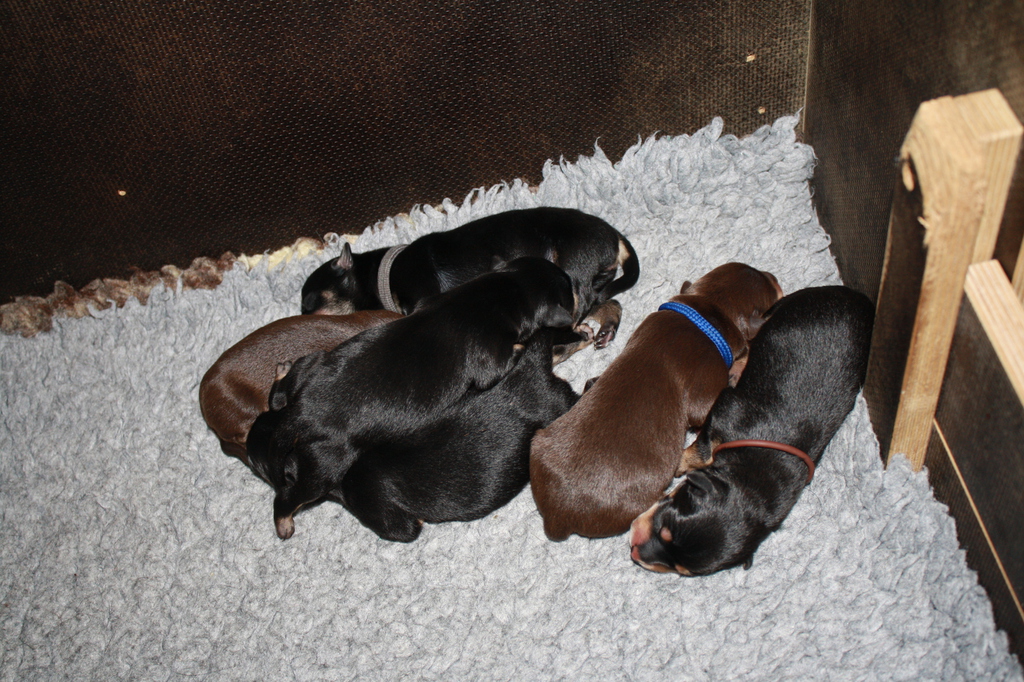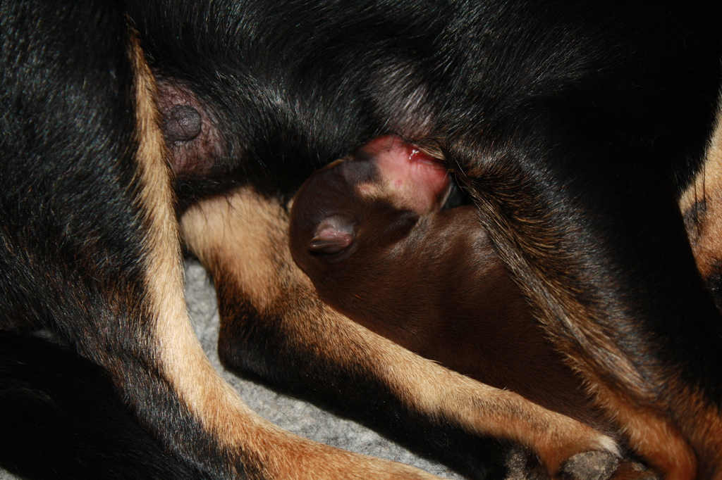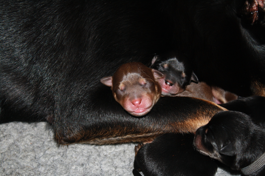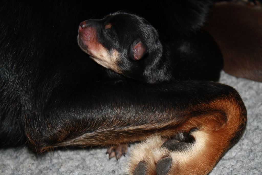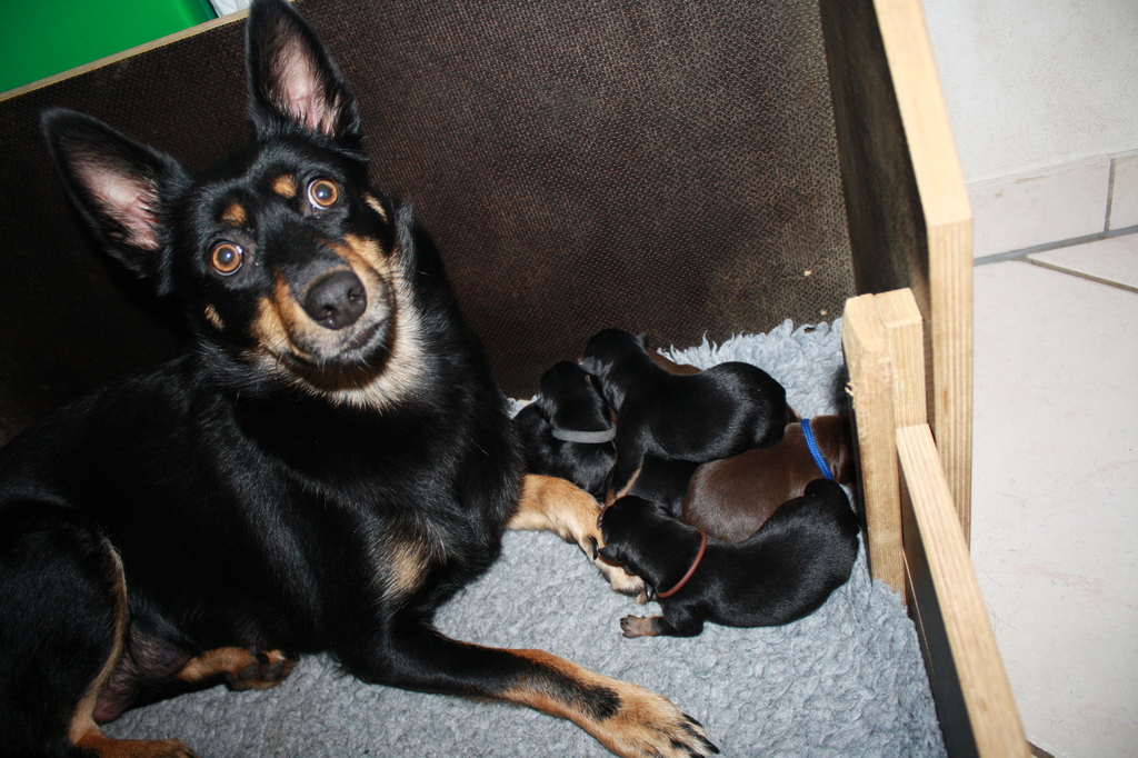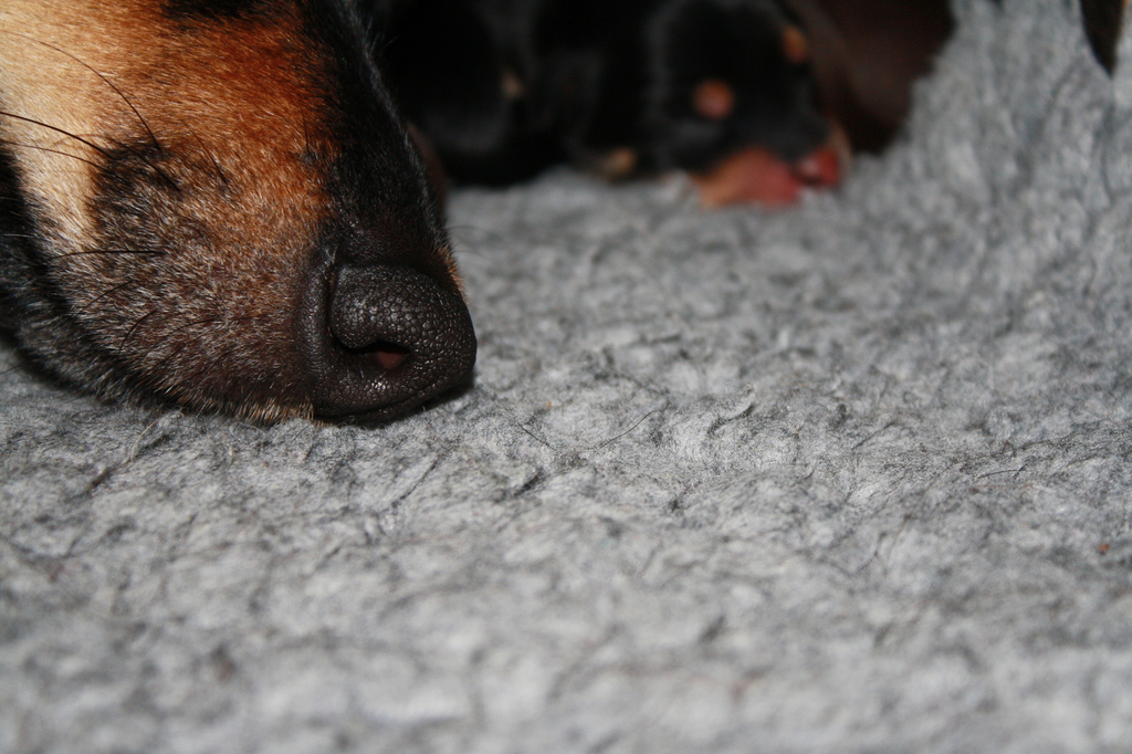 C-Wurf , 1 Tag alt. Gar nicht so einfach, ein paar gute Fotos hinzukriegen. Erst recht nicht, wenn die Mama Luzie heißt und eine Super-Mama ist, die ganz genau aufpasst, daß keiner verloren geht.