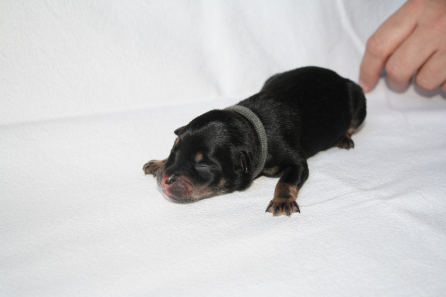 Die Erstgeborene, in Black&Tan. Ihr Tan ist sehr dunkel. Sie hat einen klitzekleinen weißen Punkt auf der Brust. Die ersten zwei Tage habe ich sie mit einem grauen Haarband markiert. Sie ist kräftig und wirkt entspannt, findet problemlos die Milchbar. Ich finde sie sehr hübsch, weil sie die dunkelste ist.
