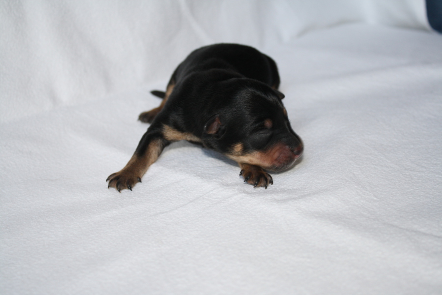 Eine sehr hübsche Hündin in Black&Tan. Keinerlei weiße Markierung. Ihr Tan ist nicht ganz so dunkel wie das ihrer beiden älteren Schwestern. Sie hat kein weiß irgendwo, komplett dunkle Krallen. Sie hat kein Halsband bekommen. Sie ist kräftig, fit, wirkt recht entspannt, da sie auch mal alleine liegt.